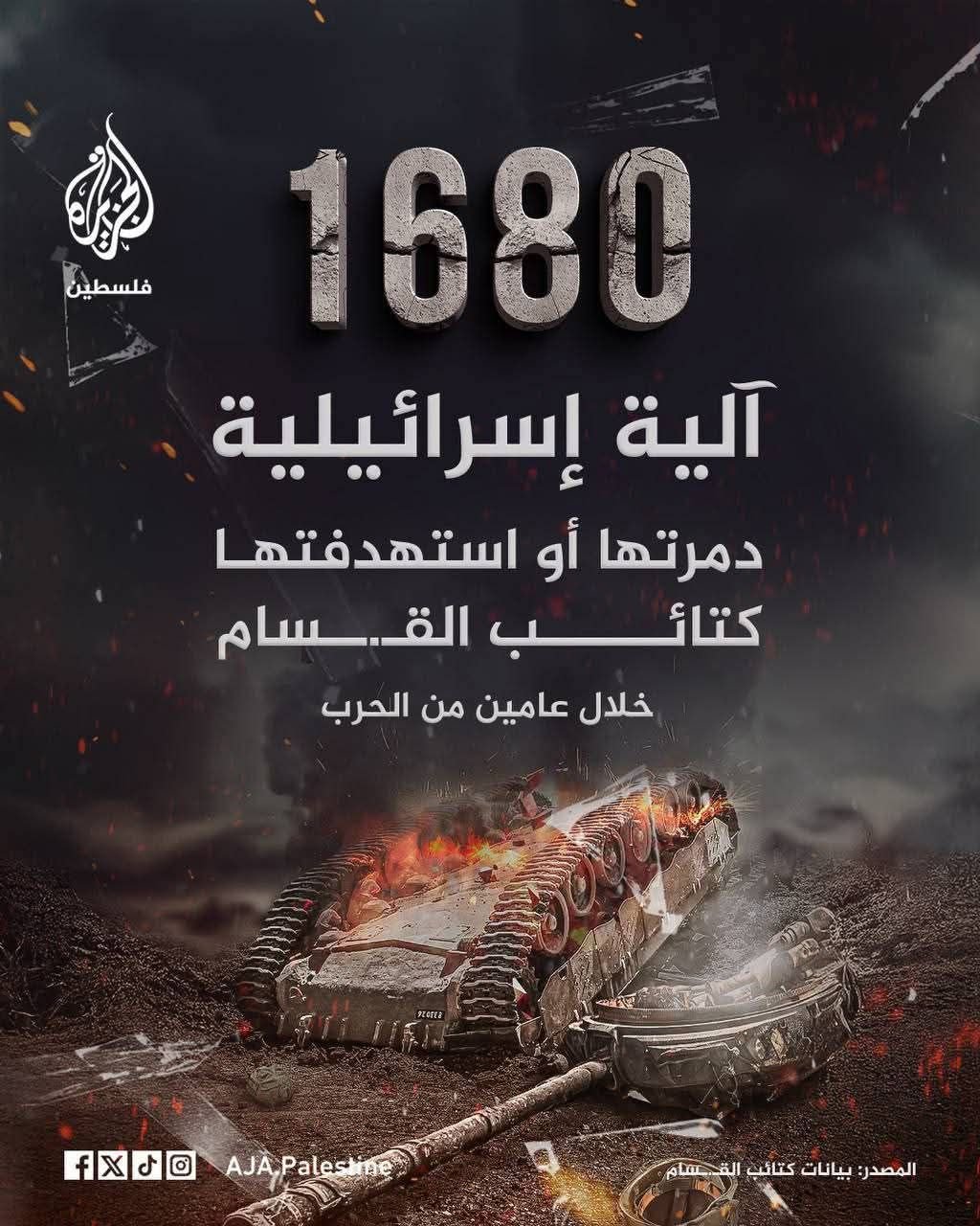 🔻1.680 kendaraan militer Israel berhasil dihancurkan atau diserang oleh Brigade Al-Qassam selama dua tahun perang.