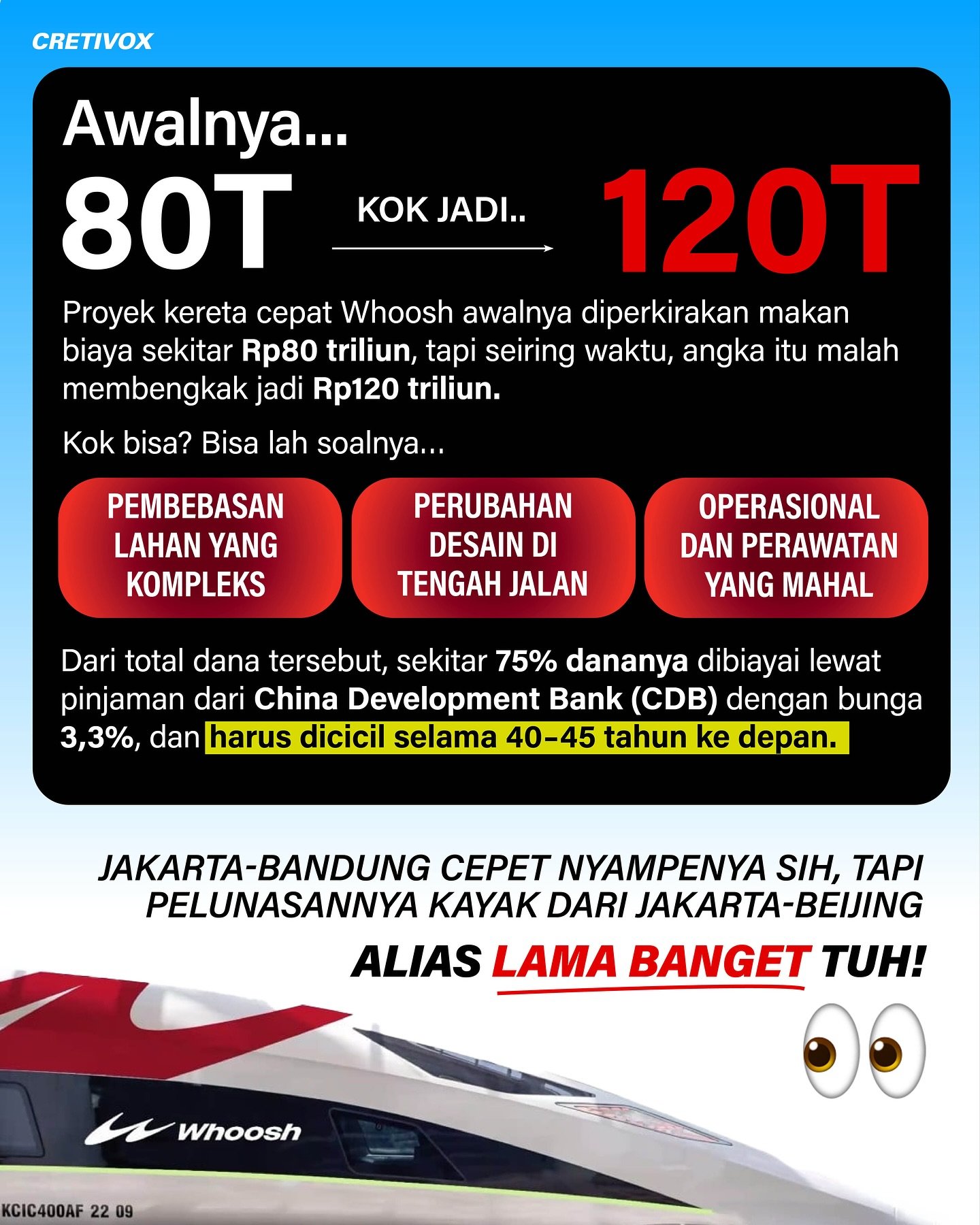 - Tapi di balik cepatnya WHOOSH, ada cicilan Rp 2 Triliun tiap tahun selama 60 tahun yang harus dibayar pelan-pelan.