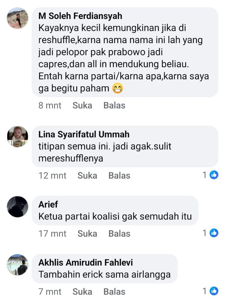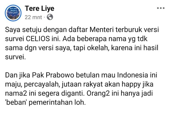 Dan jika Pak Prabowo betulan mau Indonesia ini maju, percayalah, jutaan rakyat akan happy jika nama-nama ini segera diganti. Orang-orang ini hanya jadi ‘beban’ pemerintahan loh,” ujar Tere Liye.