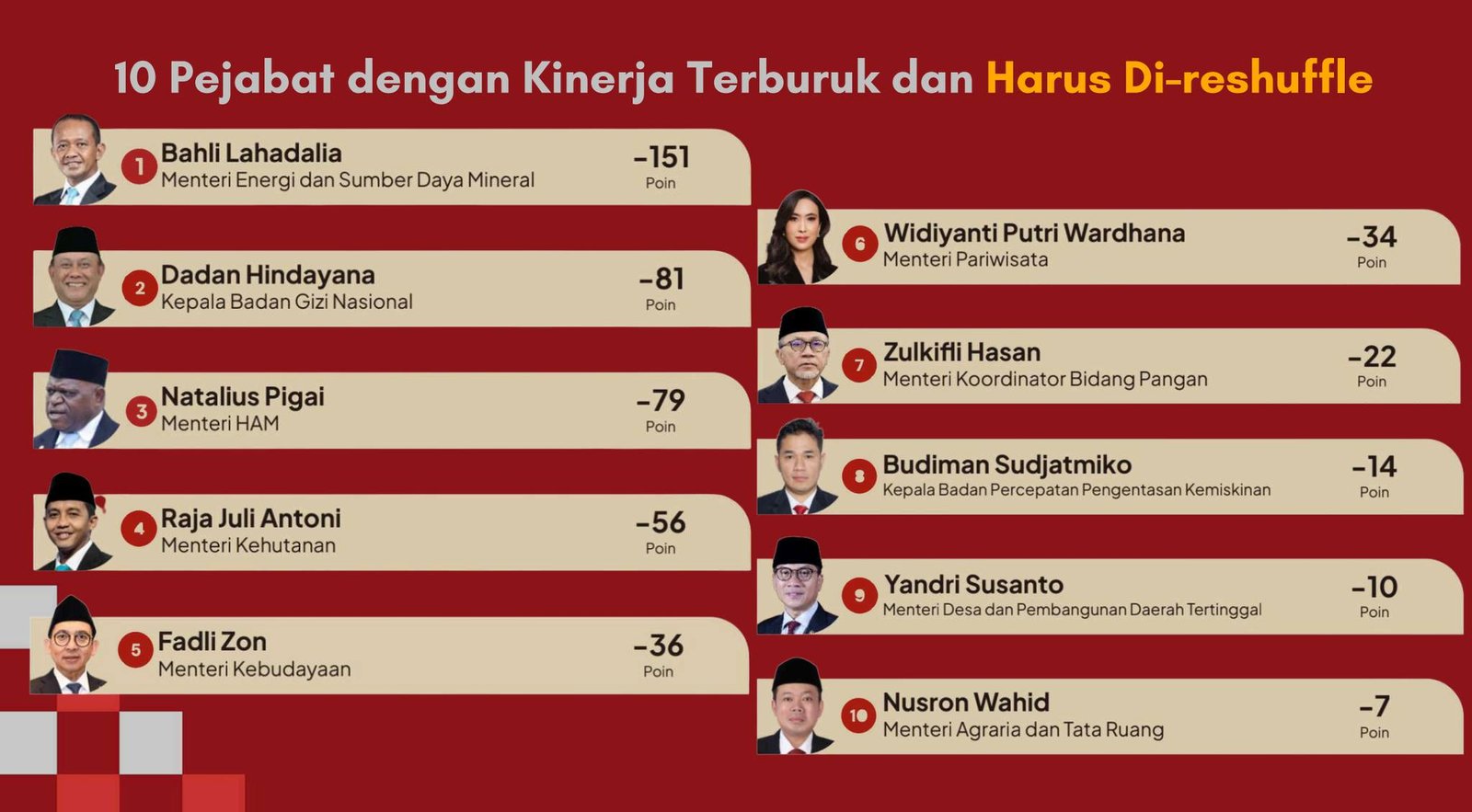 Berikut ini daftar 10 pejabat dengan kinerja terburuk (nilainya MINUS) dan harus di-reshuffle (menurut data survei Celios) :