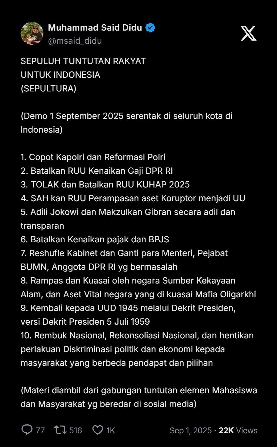 (Demo 1 September 2025 serentak di seluruh kota di Indonesia)