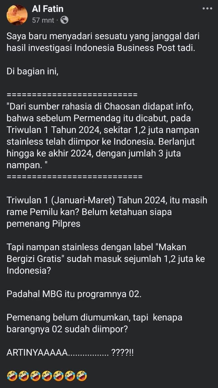 “Dari sumber rahasia di Chaosan didapat info, bahwa sebelum Permendag itu dicabut, pada Triwulan 1 Tahun 2024, sekitar 1,2 juta nampan stainless telah diimpor ke Indonesia. Berlanjut hingga ke akhir 2024, dengan jumlah 3 juta nampan. “
