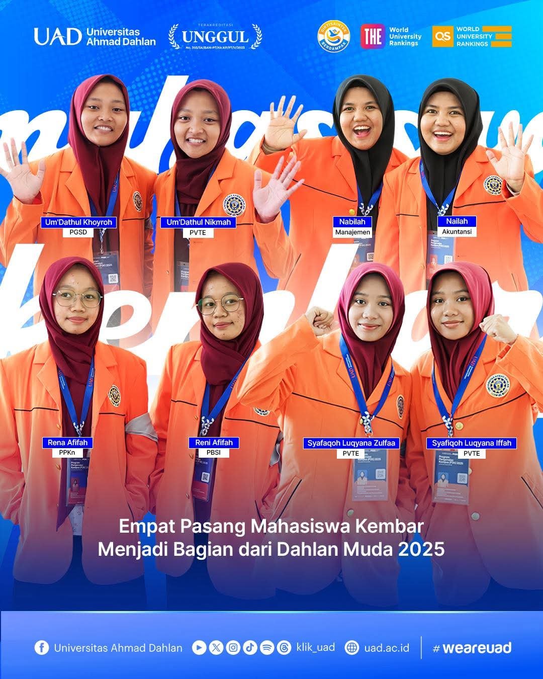 Empat pasang mahasiswi kembar 👠resmi bergabung sebagai keluarga baru UAD (Universitas Ahmad Dahlan Yogyakarta). Mereka datang dengan semangat yang sama, langkah yang beriringan, dan cita-cita yang membara untuk menimba ilmu di kampus unggul dan berkemajuan.✨