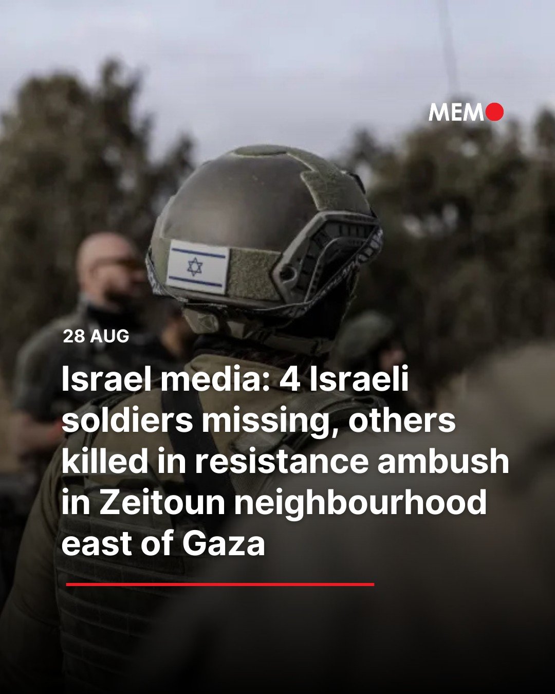 Media Israel melaporkan bahwa 4 tentara hilang, sementara yang lainnya tewas dan terluka di Gaza, sebagai bagian dari penyergapan besar-besaran untuk menangkap tentara Israel yang dilakukan oleh Brigade Qassam di lingkungan Zeitoun, di timur Kota Gaza, tadi malam (Jumat, 29 Agustus 2025).