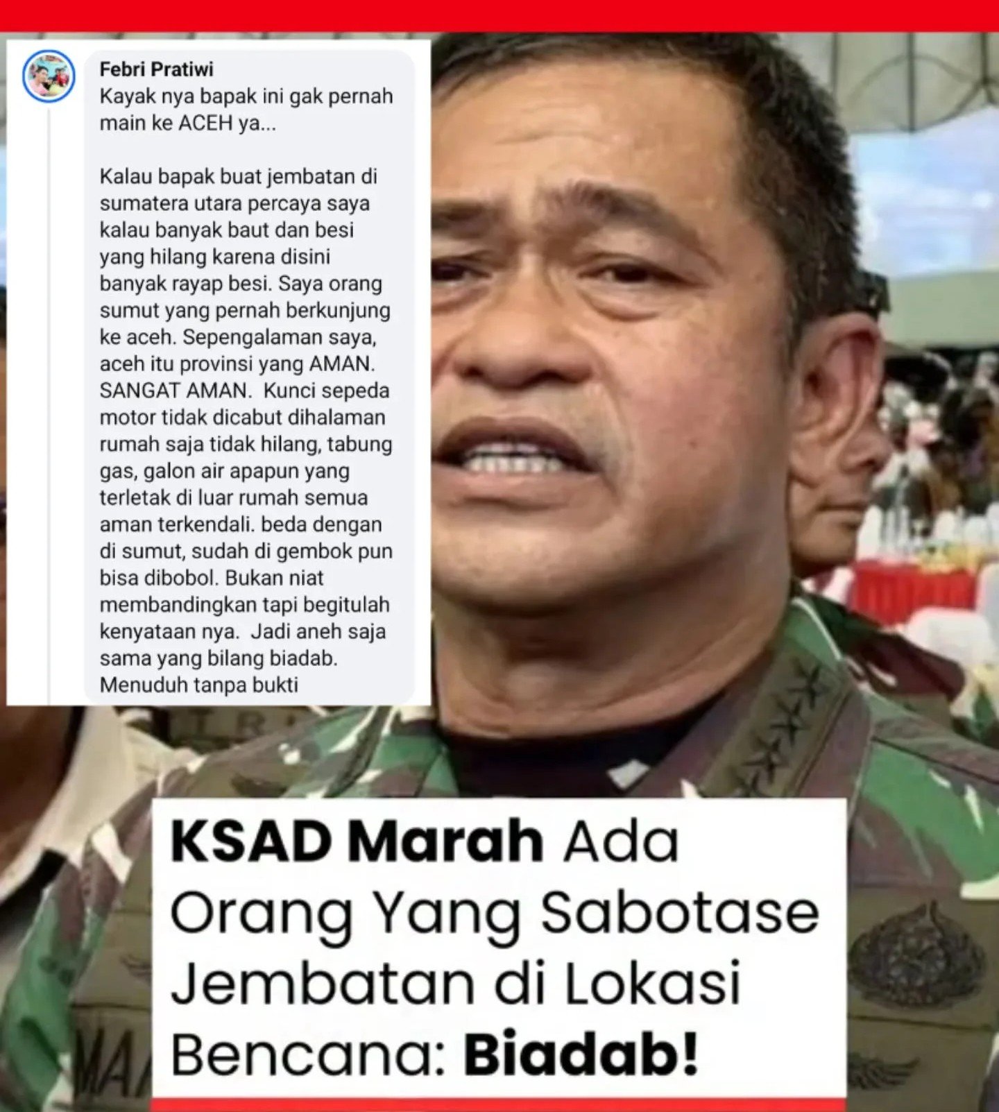 Awalnya dalam rapat anggaran penanganan bencana dengan Menkeu Purbaya Yudhi Sadewa bapak itu (KSAD) mengajukan penambahan anggaran dengan alasan “tentara cuma dikasih makan dilapangan”, ketika Purbaya sedang mencerna hal ini, Kepala BNPB Letjen Suharyanto buru-buru membantah hal ini bahkan menjelaskan ada anggaran buat setiap anggota TNI yang dikerahkan ke lokasi bencana dari dua pos anggaran yaitu anggaran uang makan 45ribu/orang dan uang lelah 120rb/orang, jadi tiap prajurit mendapat 165rb/hari dikali 40 hari (hingga hari ini) dikali 49.000 anggota jadi 8 milyar lebih perharinya yang harus dikeluarkan Menkeu.