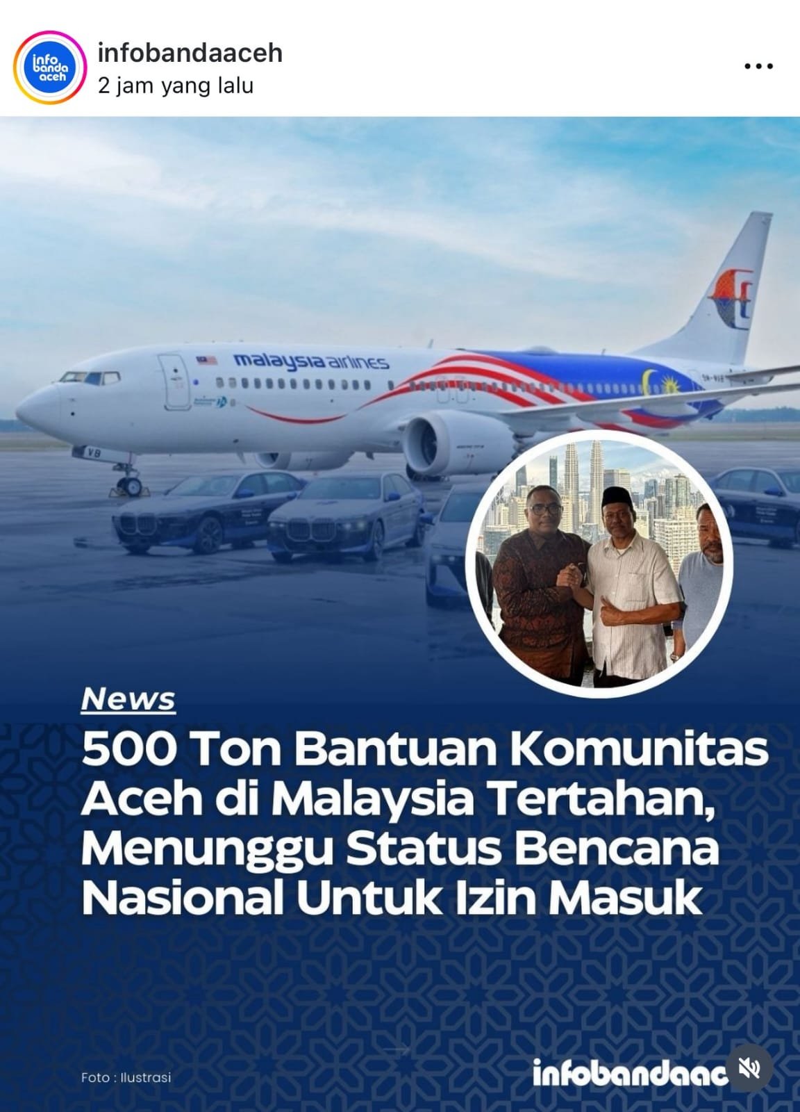 Sebanyak 500 ton bantuan logistik dari komunitas Aceh di Malaysia yang siap dikirimkan melalui kapal laut swasta dari Port Klang ke Krueng Geukeuh, Aceh, saat ini belum dapat diproses yang dikarenakan belum diberlakukannya Bencana Nasional dari Pemerintah Indonesia.