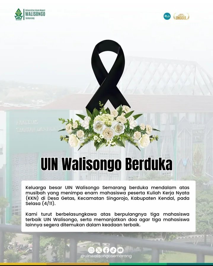 Enam mahasiswa Universitas Islam Negeri (UIN) Semarang yang sedang Kuliah Kerja Nyata (KKN) di Desa Getas, Kecamatan Singorojo, Kabupaten Kendal, hanyut saat bermain air di Tubing Genting Jolinggo, Selasa (4/11/2025).