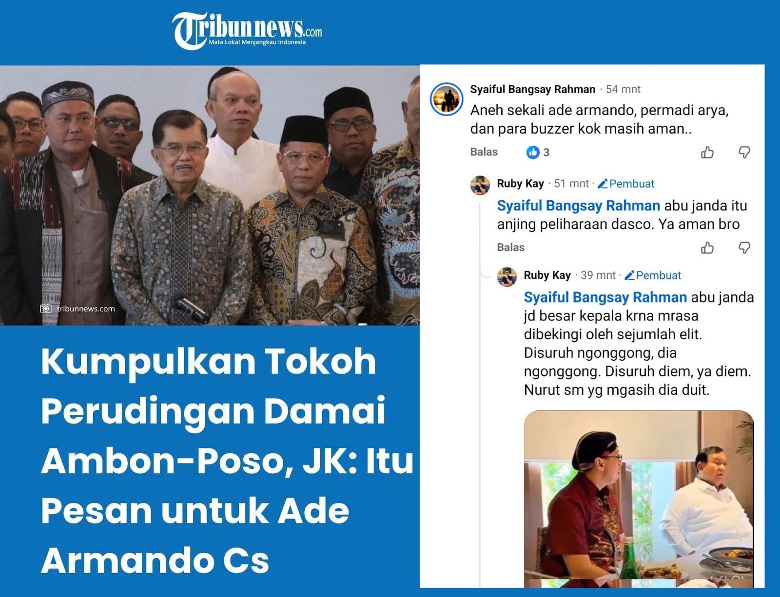Ujug-ujug Ade Armando, Permadi Arya dan sebagian netizen kelas teri di media sosial yang belum tau bagaimana sulitnya mendamaikan dua kubu yang saling baku bunuh, menuduh JK sebagai provokator. Literasi lu berarti masih sangat rendah, tapi sudah berlagak menjadi pihak yang merasa dirinya paling toleran.