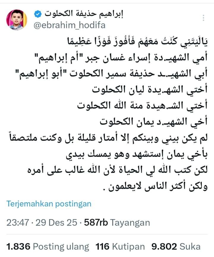 *Juru Bicara Brigade Al-Qassam Abu Ubaidah dibom Israel saat sedang berkumpul bersama keluarganya pada Agustus 2025. Yang selamat tersisa 1 putranya, Ibrahim.