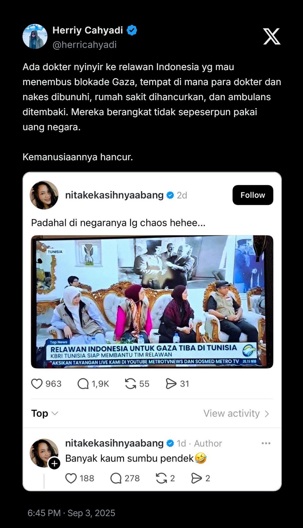 Ada dokter nyinyir ke relawan Indonesia yang mau menembus blokade Gaza, tempat di mana para dokter dan nakes dibunuhi, rumah sakit dihancurkan, dan ambulans ditembaki. Mereka berangkat tidak sepeserpun pakai uang negara.
