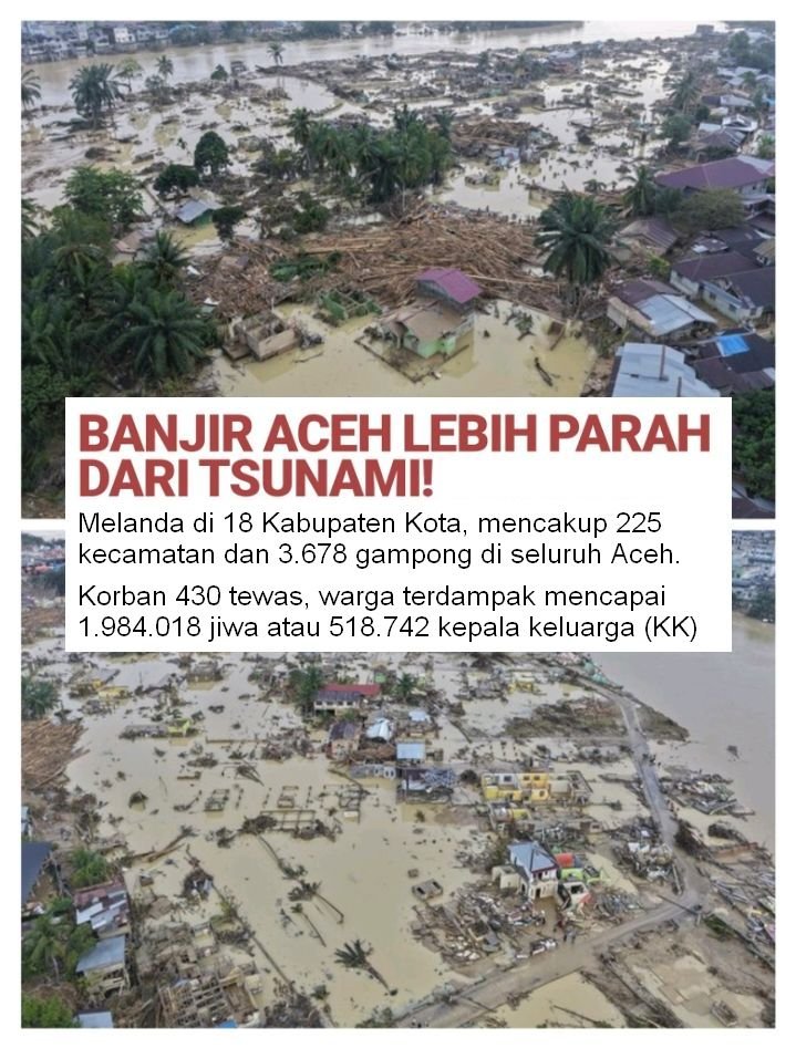 Di Aceh, bencananya bukan satu-dua titik. Terjadi di 18 kabupaten/kota. Korban jiwa ratusan. Pengungsi menyentuh setengah juta lebih. Infrastruktur lumpuh: jalan putus, jembatan ambruk, sekolah, pesantren, rumah sakit rusak. Ada wilayah yang terisolasi, akses bantuan sulit