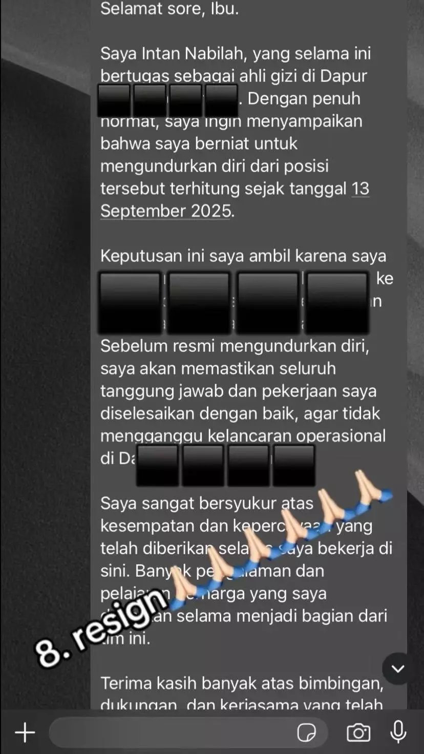 Pada akhirnya, daftar panjang itu ditutup dengan sebuah keputusan. Ia memilih untuk berhenti dari pekerjaannya. “8. resign,” endingnya.