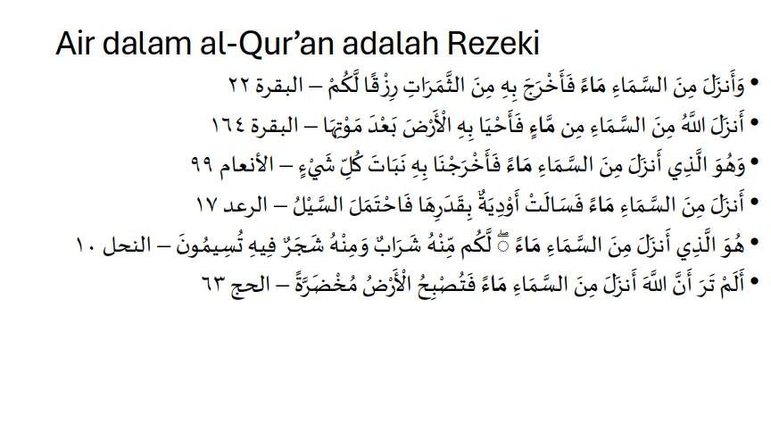 Salah satu yang saya jelaskan adalah bahwa konsep awalnya air diciptakan adalah untuk kehidupan. Banyak ayat dalam al-Qur’an yang menjelaskan tentang hujan dan konteks keseluruhannya adalah bahwa hujan selalu diikuti dengan tanaman dan ternak yang menjadi penopang kehidupan manusia.