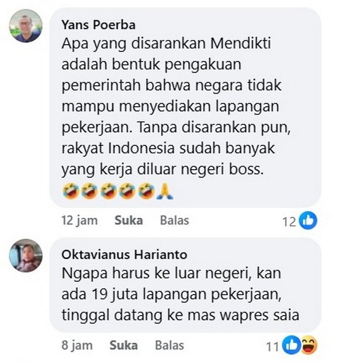 “Apa yang disarankan Mendikti adalah bentuk pengakuan pemerintah bahwa negara tidak mampu menyediakan lapangan pekerjaan. Tanpa disarankan pun, rakyat Indonesia sudah banyak yang kerja diluar negeri boss. 🤣🤣🤣🤣🤣🙏,” komen netizen Yans Poerba.