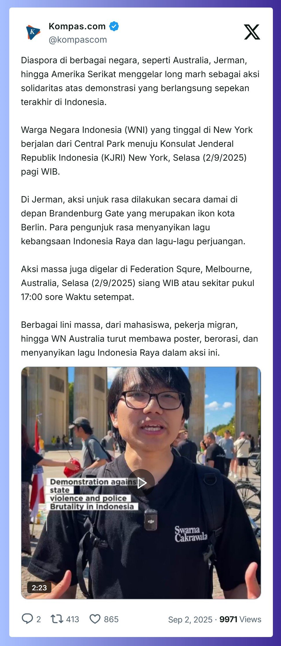Aksi massa juga digelar di Federation Squre, Melbourne, Australia, Selasa (2/9/2025) siang WIB atau sekitar pukul 17:00 sore Waktu setempat.