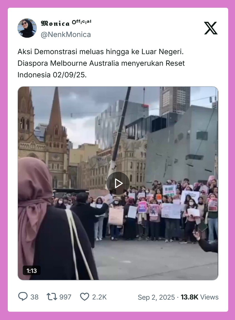 Aksi massa juga digelar di Federation Squre, Melbourne, Australia, Selasa (2/9/2025) siang WIB atau sekitar pukul 17:00 sore Waktu setempat.
