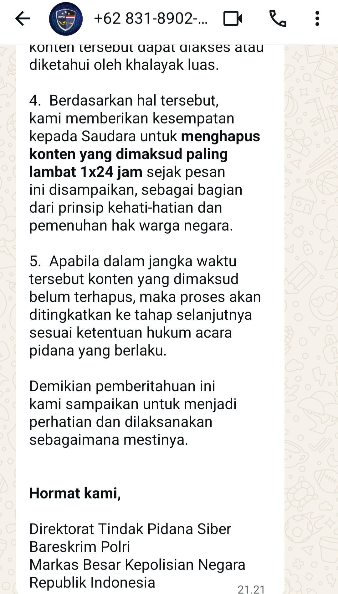 “Saya baru saja mendapatkan kiriman WA dari nomor yang mengatasnamakan Direktorat Tindak Pidana Siber Bareskrim Polri.