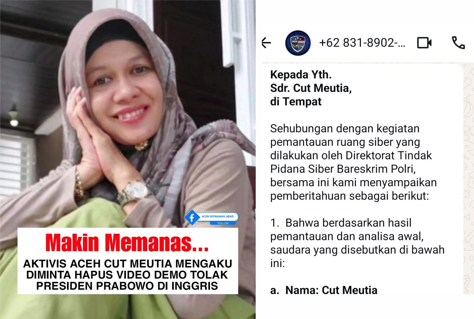Seorang aktivis asal Aceh, Cut Meutia, mengaku menerima pesan WhatsApp yang mengatasnamakan Direktorat Tindak Pidana Siber Bareskrim Polri, Mabes Polri, yang meminta dirinya menghapus konten media sosial terkait aksi demonstrasi penolakan terhadap Presiden Prabowo Subianto saat kunjungan ke Inggris.