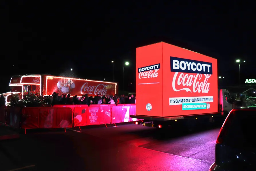 Mobil van PSC ini mengikuti tur truk Natal tahunan Coca-Cola untuk menyerukan orang-orang agar memboikot Coca-Cola karena hubungannya dengan Israel.