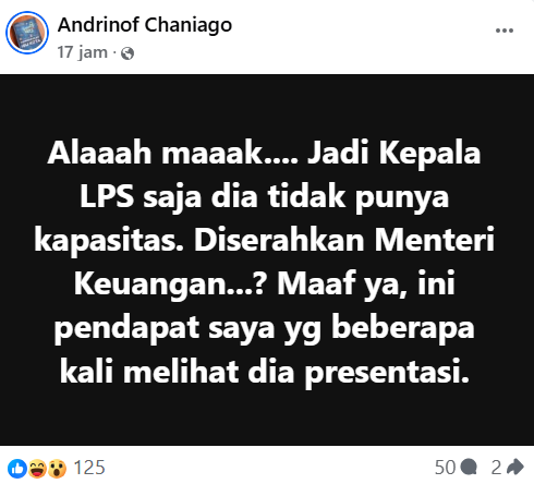 “Alaaah maaak…. Jadi Kepala LPS saja dia tidak punya kapasitas. Diserahkan Menteri Keuangan…? Maaf ya, ini pendapat saya yg beberapa kali melihat dia presentasi.”