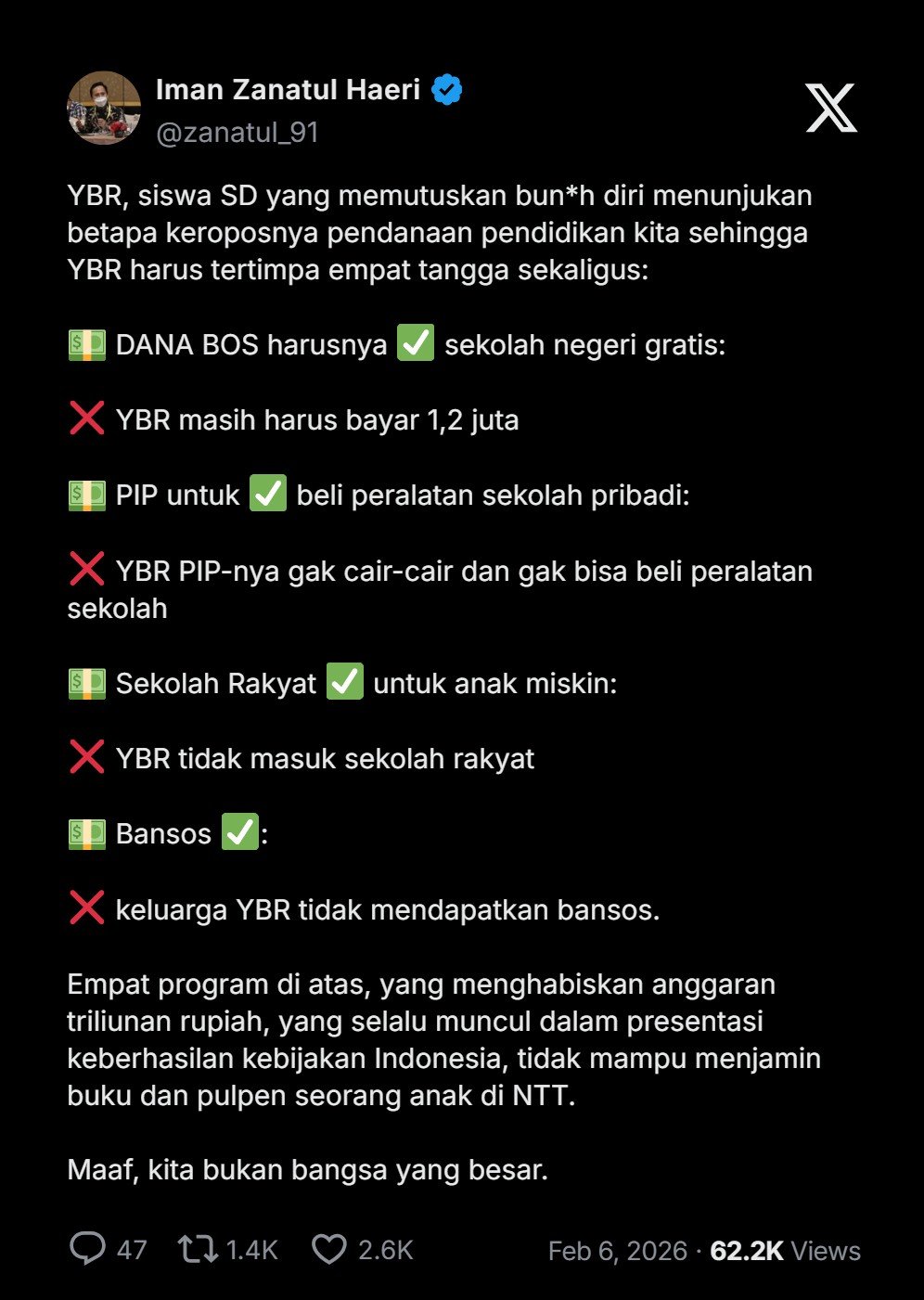 YBR, siswa SD yang memutuskan bun*h diri menunjukan betapa keroposnya pendanaan pendidikan kita sehingga YBR harus tertimpa empat tangga sekaligus: