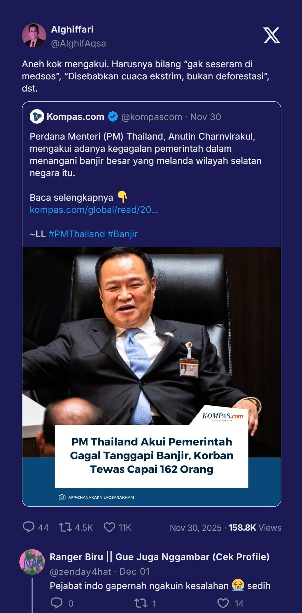 ANEH… Perdana Menteri Thailand, Anutin Charnvirakul, mengakui adanya kegagalan pemerintah dalam menangani banjir besar yang melanda wilayah selatan negara itu yang telah menewaskan 162 orang.