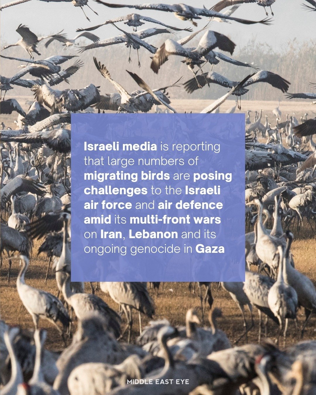 Laporan dari Middle East Eye menyebutkan bahwa gelombang besar burung migran seperti pelikan dan bangau ikut mempersulit sistem pertahanan udara Israel. Fenomena ini terjadi di tengah konflik yang melibatkan Israel dengan beberapa pihak di kawasan, termasuk Iran dan kelompok-kelompok perlawanan di wilayah Gaza serta Lebanon.