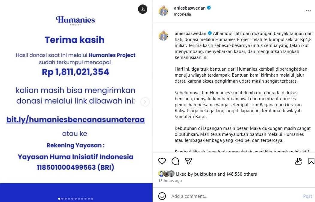 Mantan Gubernur DKI Jakarta, Anies Baswedan, mengumumkan bahwa donasi untuk korban banjir bandang dan longsor di Sumatra yang dihimpun melalui Humanies Project telah mencapai sekitar Rp1,8 miliar.