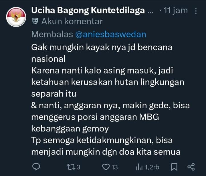 Mantan Gubernur DKI Jakarta, Anies Baswedan, mendesak pemerintah pusat menetapkan bencana banjir dan longsor yang melanda Aceh, Sumatera Utara, dan Sumatera Barat sebagai Bencana Nasional.
