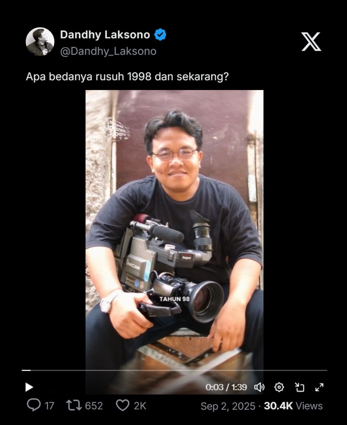 Apa bedanya rusuh 1998 dan sekarang?AdminRabu, 3 September, 2025VIDEO Apa bedanya rusuh 1998 dan sekarang? Berikut pandangan Dandhy Laksono, jurnalis yang mengalami kejadian 1998. simak video dibawah [VIDEO] Apa bedanya rusuh 1998 dan sekarang? pic.twitter.com/waCeQgYJYv— Dandhy Laksono (@Dandhy_Laksono) September 2, 2025 Jangan LewatkanAktor penjual tanah airKemenhut bilang tumbang alami, tapi kenapa potongannya rapi dan kayunya ada nomornya?7 jam bertahan akhirnya Ya AllahNGERI… Niat Bikin Parit Darurat, Jalan di Aceh Justru Amblas Kian ParahKOCAK Prabowo vs Prabowo š¤£Pak Prabowoā¦.