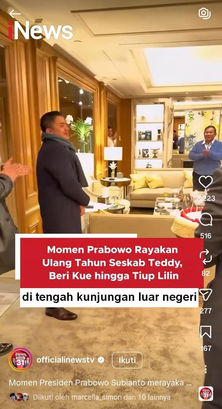 Pada kesempatan tersebut Agung Surahman, selaku rekan kerjanya memberikan kejutan kepada Teddy. Diketahui ulang tahun tersebut dirayakan di tengah kunjungan kerja Presiden Prabowo di luar negeri.