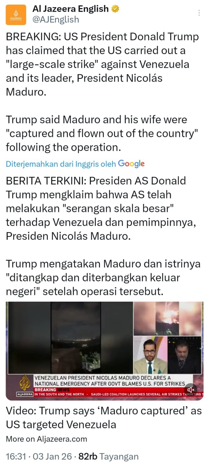 Perkembangan terbaru adalah Presiden Maduro telah ditangkap. Ini berarti kekuasaan Maduro selama 12 tahun (sejak 2013) telah berakhir.