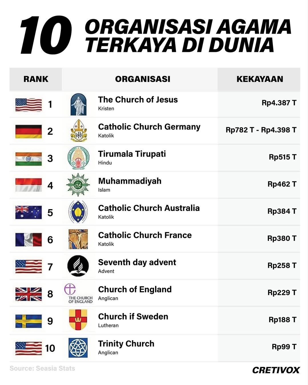 Berikut daftar lengkap 10 organisasi keagamaan terkaya di dunia: