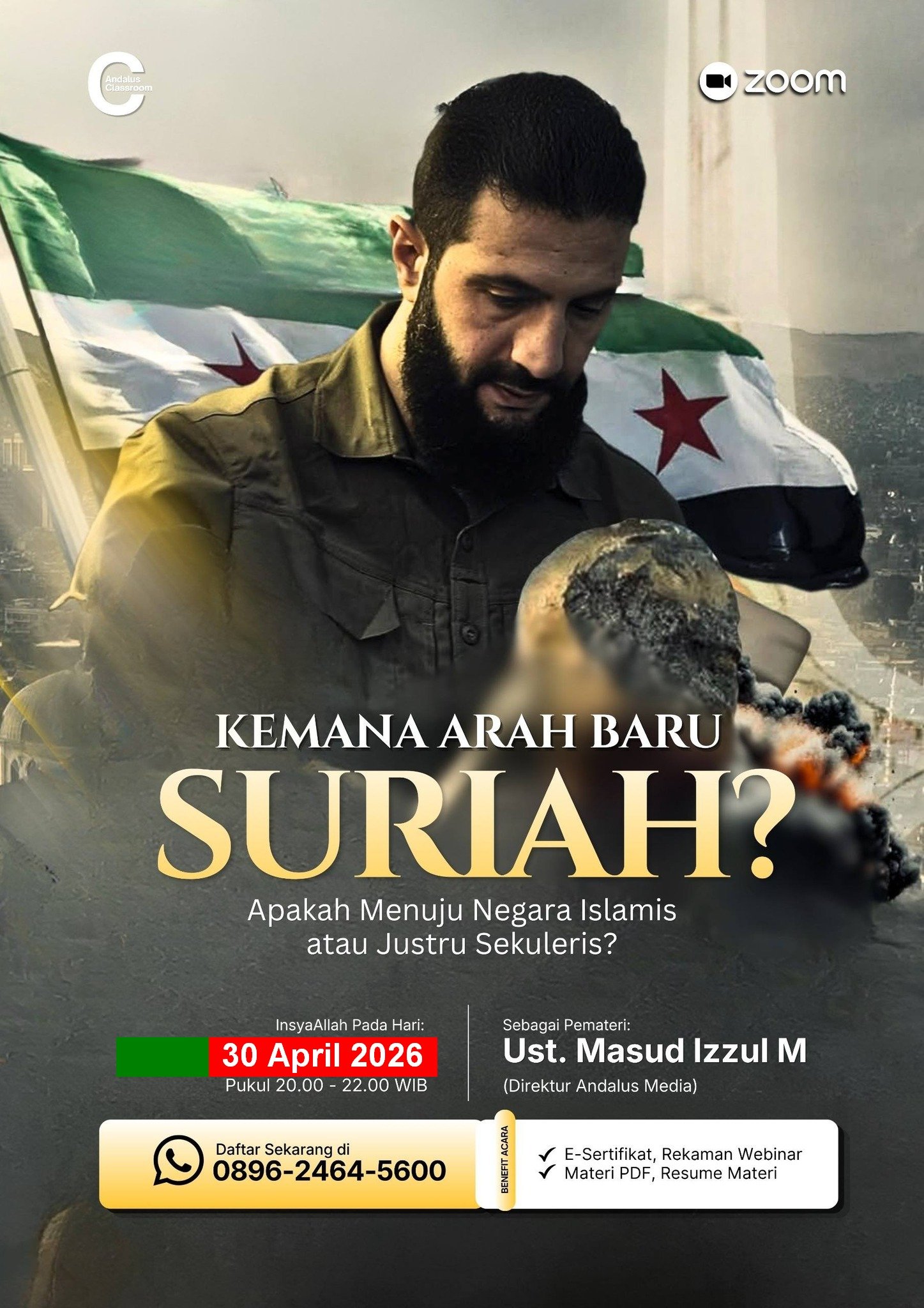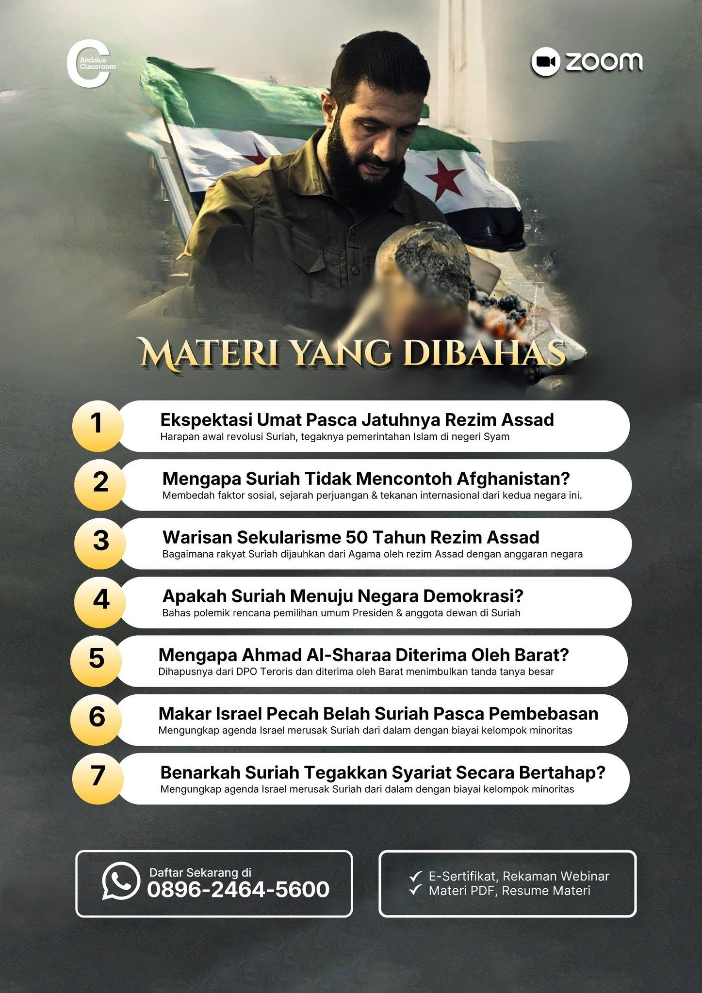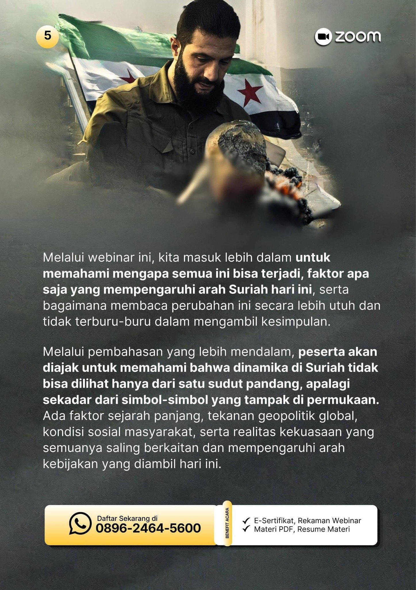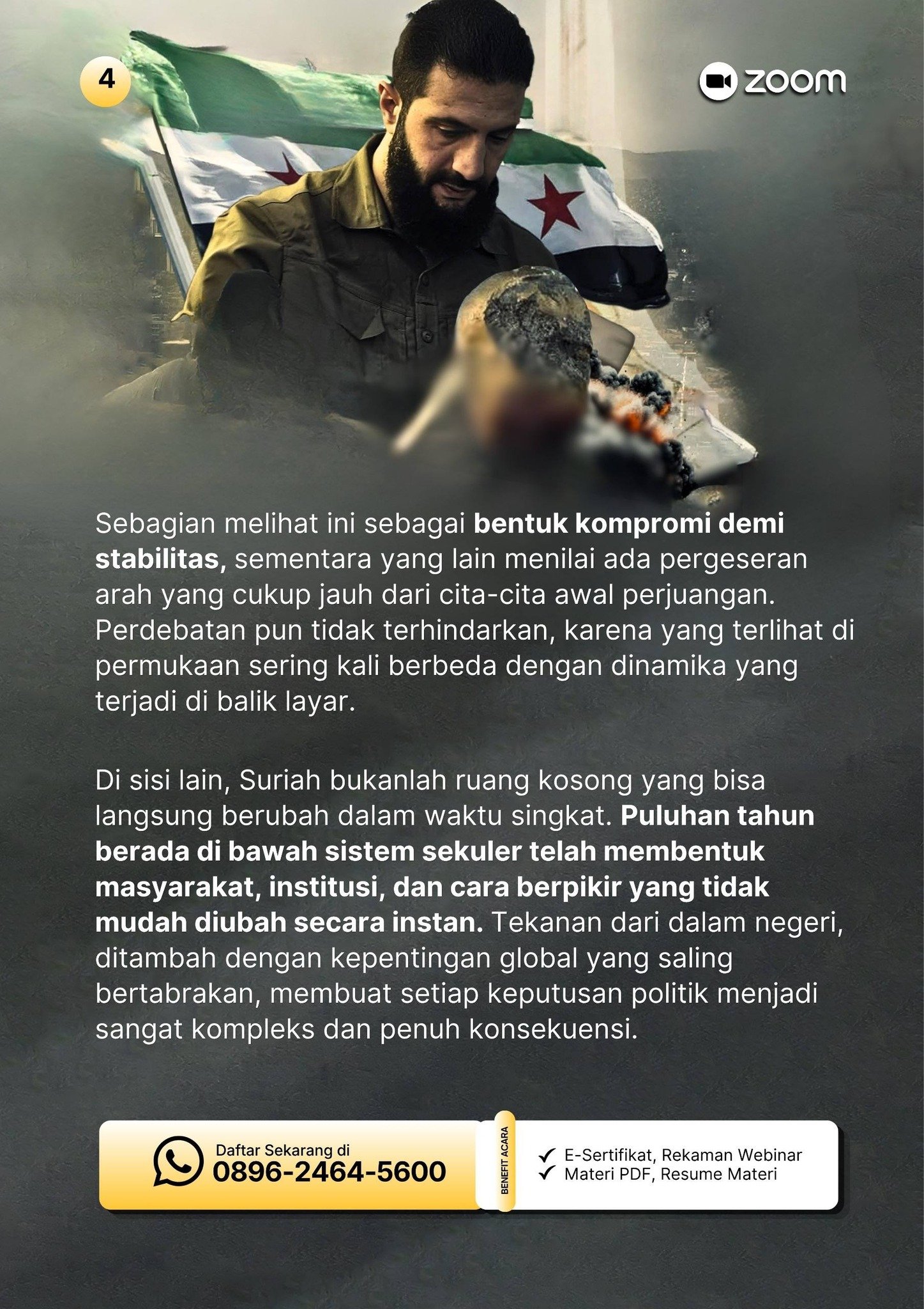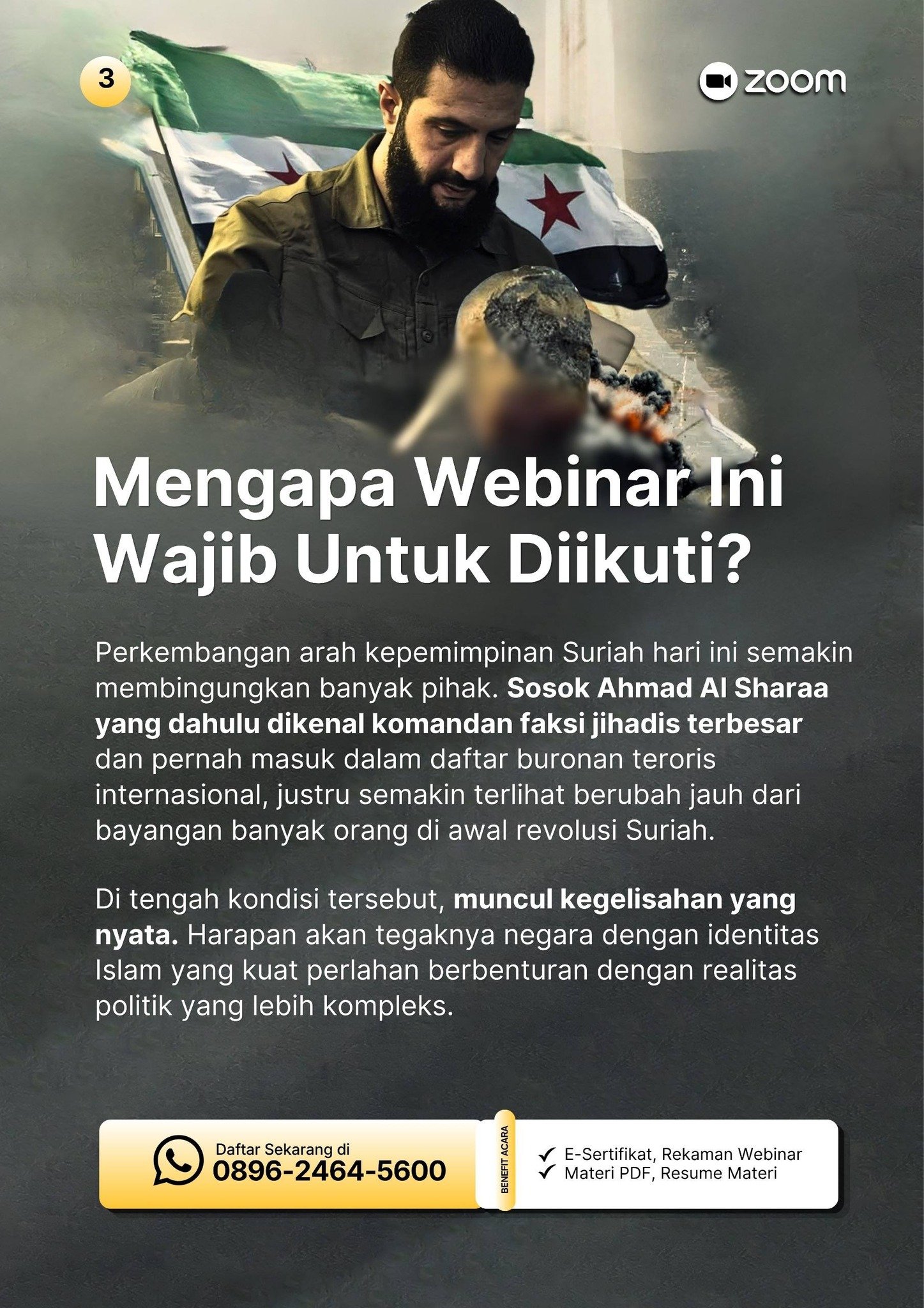 Webinar ini akan mengupas secara tajam dan mendalam, bukan sekadar apa yang terlihat di permukaan, tetapi juga apa yang sebenarnya terjadi di balik perubahan arah Suriah hari ini.