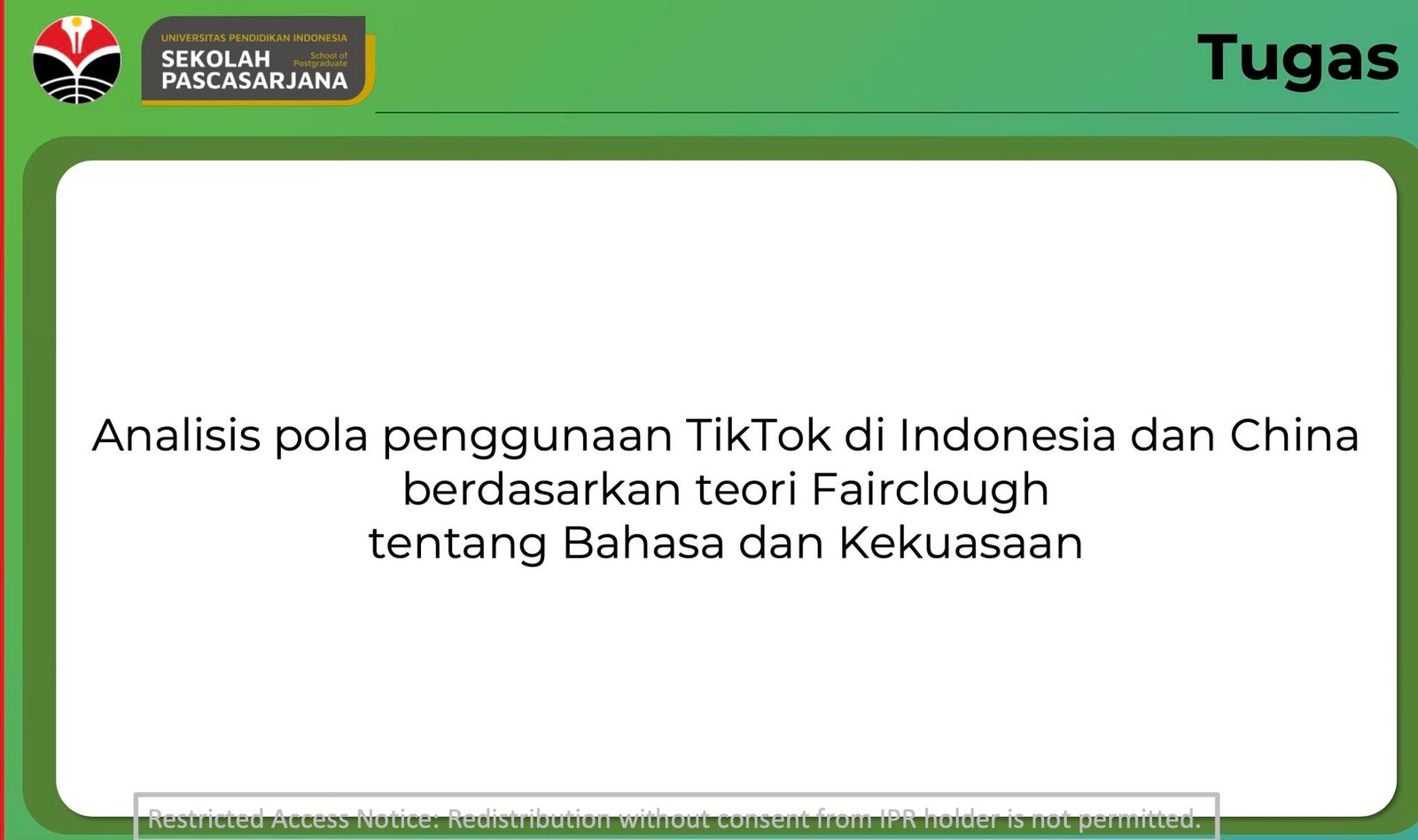 Sebelum perkuliahan dimulai, kami akan ditagih tugas pekan sebelumnya, ditanya satu-satu dan harus menjawab secara lisan tugas yang sudah dikumpulkan. Tugas dikumpulkan harus ditulis tangan, gak boleh diketik. Belum lagi tugas baca pekanan. Total semua bacaan ada 8 buku, tebal-tebal dan dalam Bahasa Inggris semua. Satu pekan satu buku. Bukan hanya sekedar dibaca namun harus dikuasai betul. Sebab nanti di kelas, Tuan Guru akan bertanya satu-satu. Saat kita menjelaskan beliau akan hafal poin itu ada di bab berapa dan halaman berapa. Bayangkan, buku ratusan halaman berbahasa Inggris beliau bisa hafal dan kuasai. Nama dan nomor Induk mahasiswa satu kelas bahkan beliau hafal hanya pada kali pertama bertemu.