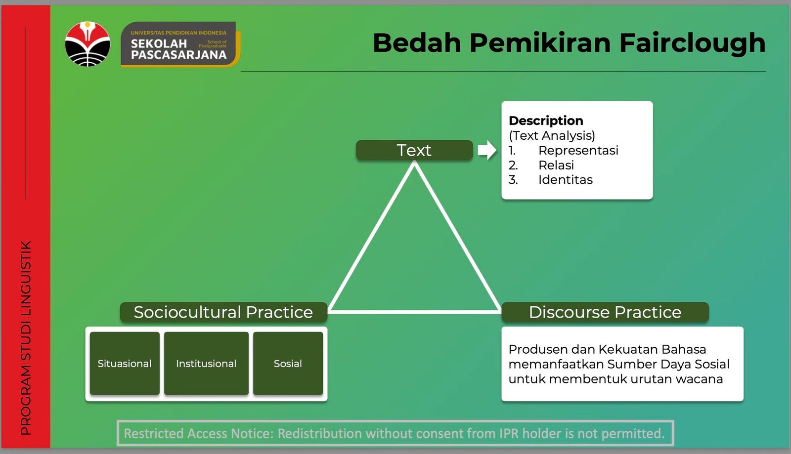 O ya, Norman Fairclough adalah salah satu “suhu” dalam bidang Critical Discourse Analysis (Analisis Wacana Kritis), disingkat CDA. Buku-bukunya menjadi semacam “kitab sucinya” anak-anak linguistik dan komunikasi. Dan Tuan Guru membedah sosok dan karya-karya Fairclough dengan sangat detail dan runtun. Masa kecil dan orangtuanya, pendidikannya, karir politiknya (yang gagal), hingga akhirnya beliau menemukan dan memfokuskan dirinya pada bidang analisis wacana kritis. Menurut Tuan Guru, kalau kita membaca karya seseorang, pelajari juga latar belakang penulisnya.