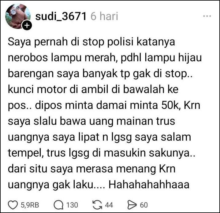 sudi 3671: Saya pernah di stop polisi katanya nerobos lampu merah, padahal lampu hijau barengan saya banyak tp gak di stop.. kunci motor di ambil di bawalah ke pos.. di pos minta damai minta 50k, Krn saya slalu bawa uang mainan trus uangnya saya lipat dan Igsg saya salam tempel, trus Igsg di masukin sakunya.. dari situ saya merasa menang krn uangnya gak lakuβ¦. Hahahahahhaaa