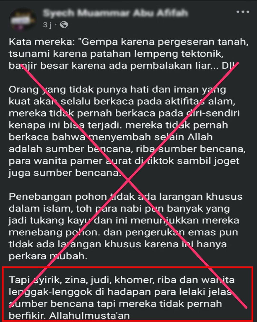 Oleh karena itu adalah keliru berat apabila ada yang mengatakan bahwa banjir, gempa, atau bencana besar itu bukan karena sebab alamiah, akan tetapi karena perempuan pamer àurot atau joget-joget di TikTok.