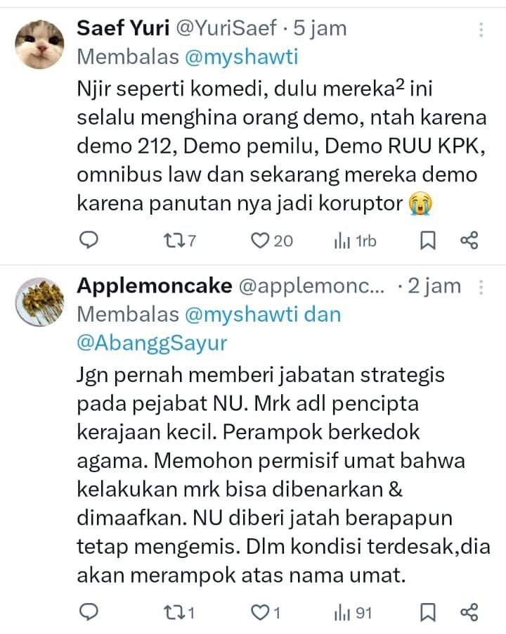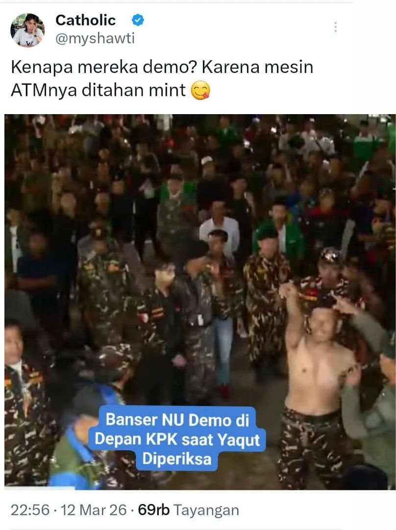 Aksi itu terjadi tidak lama setelah Yaqut dibawa ke rumah tahanan (rutan) KPK usai menjalani pemeriksaan sebagai tersangka dalam kasus dugaan korupsi kuota haji tahun 2023–2024.
