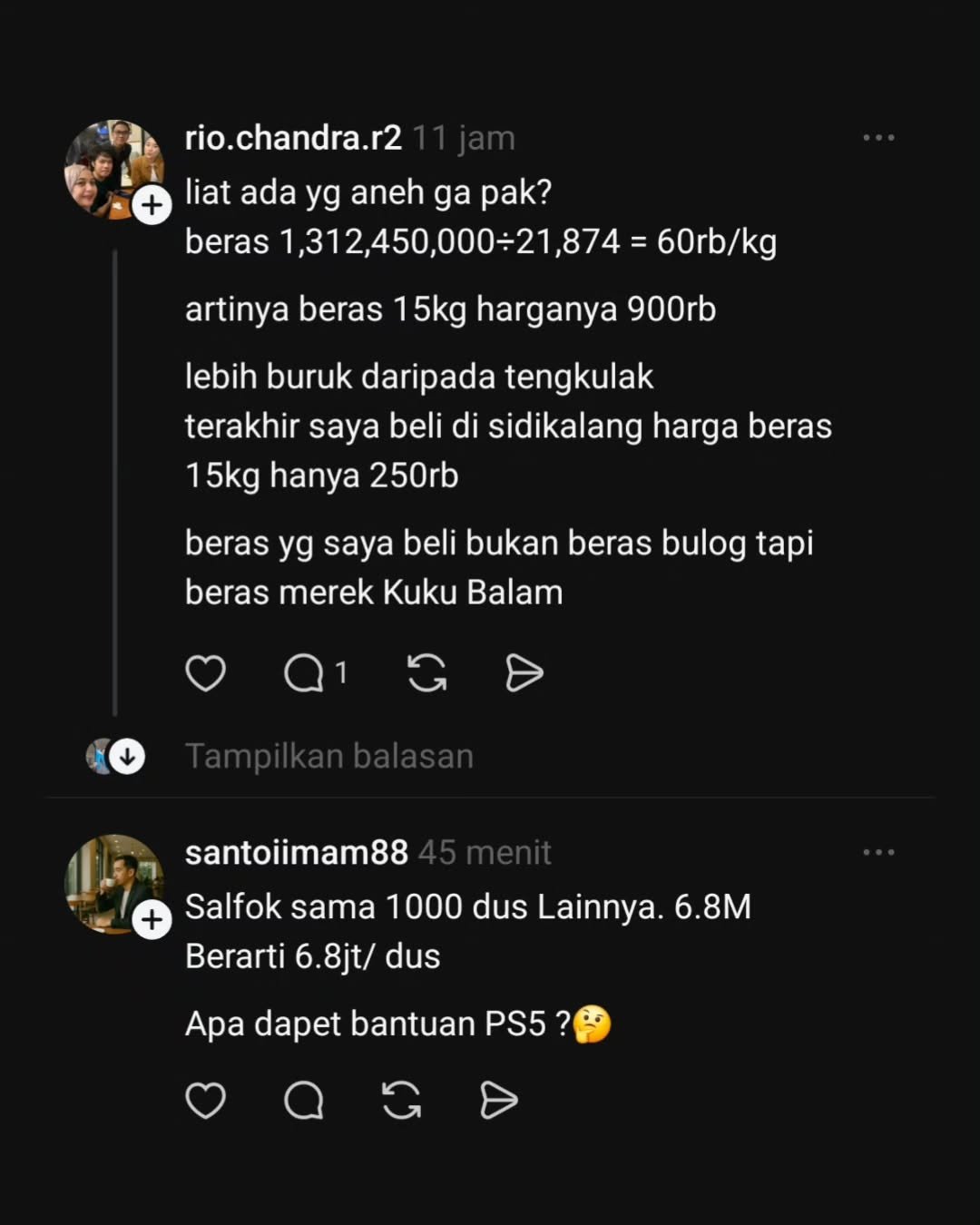 Kejanggalan paling jelas tampak pada item beras. Dalam tabel itu, Kementan mencatat volume 21.874 kilogram dengan nilai Rp 1.312.450.000. Jika dihitung, harga satu kilogram beras mencapai sekitar Rp 60.000. Angka ini sangat tidak wajar karena jauh lebih tinggi dari harga beras premium nasional yang berada pada kisaran Rp 14.000 sampai Rp 18.000 per kilogram. Bahkan bantuan pemerintah biasanya memakai beras medium dengan harga jauh lebih rendah. Perbedaan harga setinggi ini menimbulkan pertanyaan dasar, apakah terjadi salah input, kesalahan satuan, atau justru ada markup yang belum dijelaskan kepada publik.