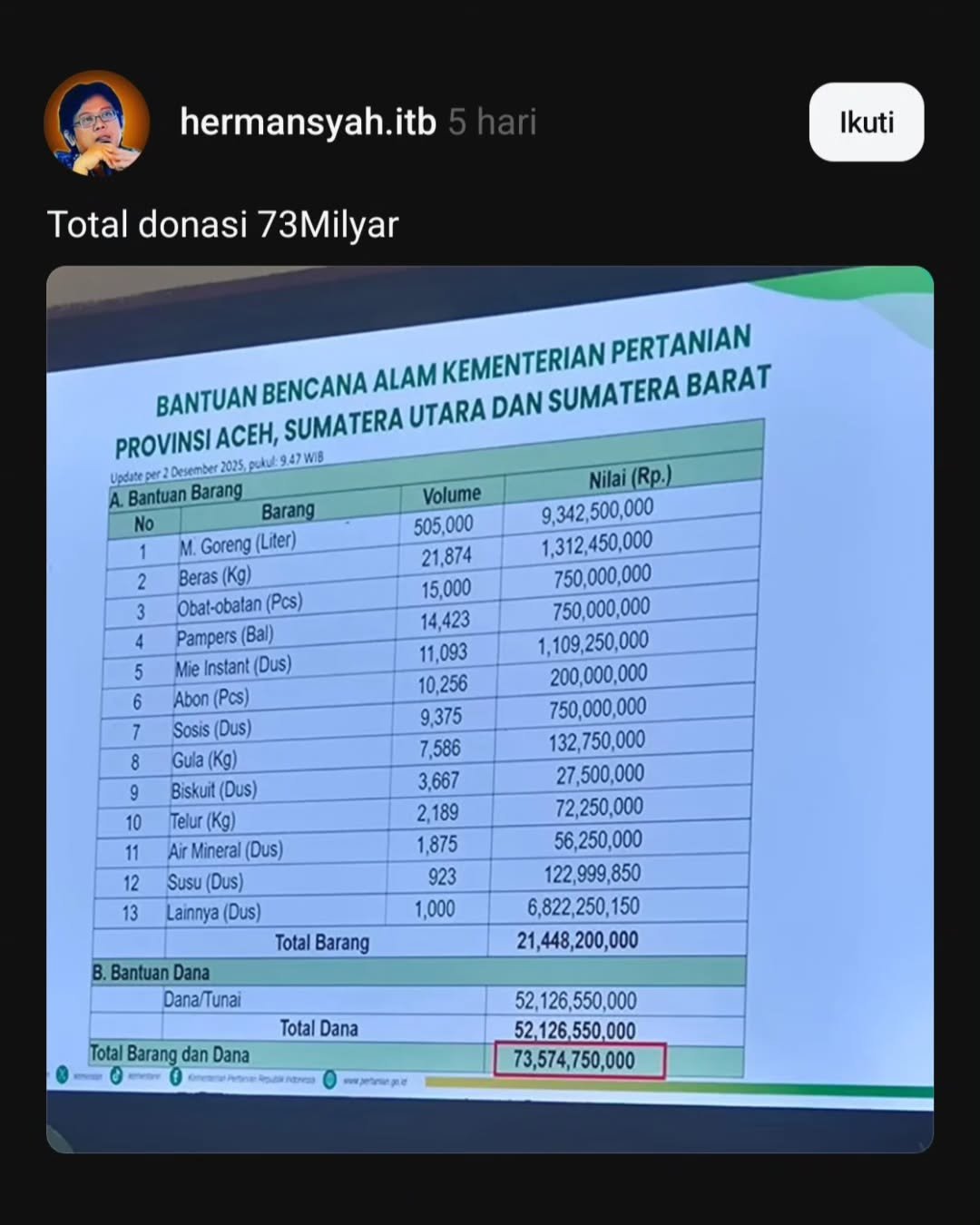 Penggalangan bantuan Kementerian Pertanian (Kementan) untuk korban banjir di Aceh, Sumatera Utara, dan Sumatera Barat awalnya disambut positif oleh masyarakat. Namun publik mulai mempertanyakan transparansi setelah beredar sebuah slide perincian bantuan yang menunjukkan sejumlah kejanggalan mencolok. Alih-alih menambah kepercayaan, angka-angka dalam tabel tersebut justru memicu kritik karena tidak sesuai dengan harga pasar maupun logika penyaluran bantuan.