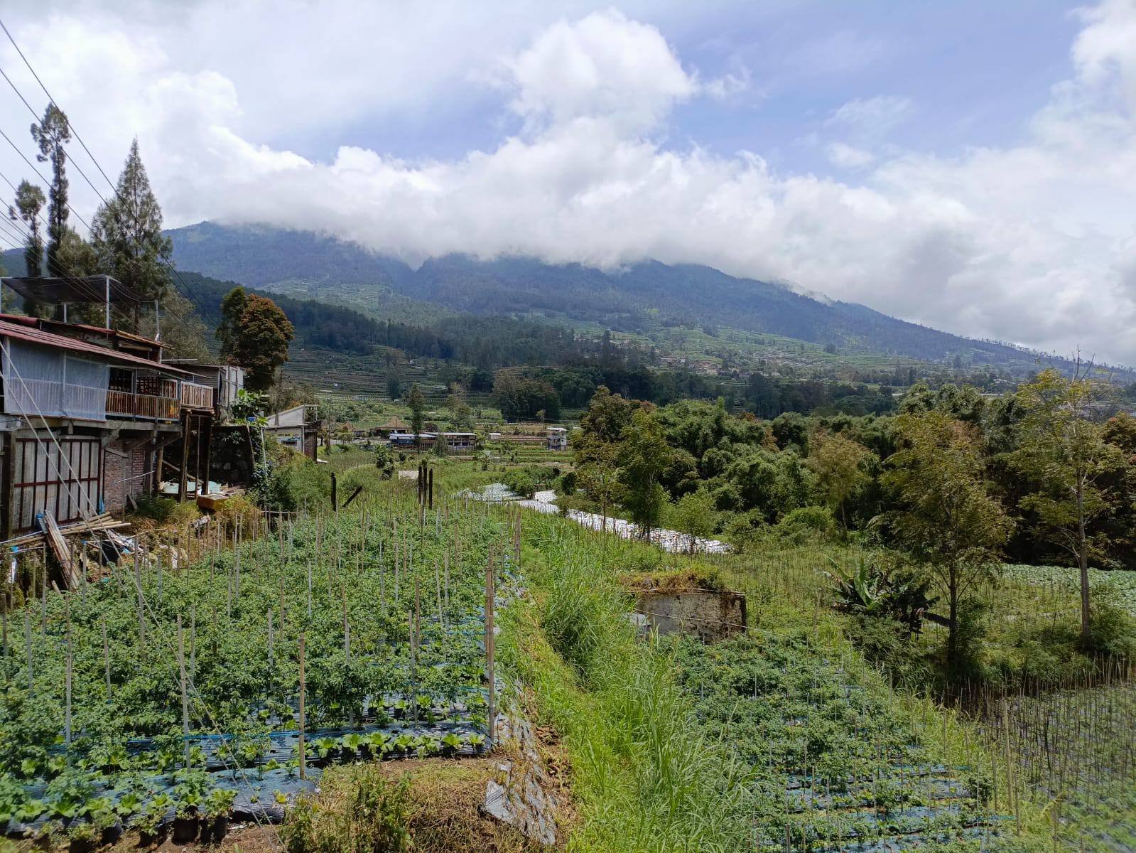 Perpaduan pemandangan deretan pegunungan dengan hamparan sayur hijau membuat kami betah berlama-lama di dusun ini. Seolah kami berada di negeri dongeng.