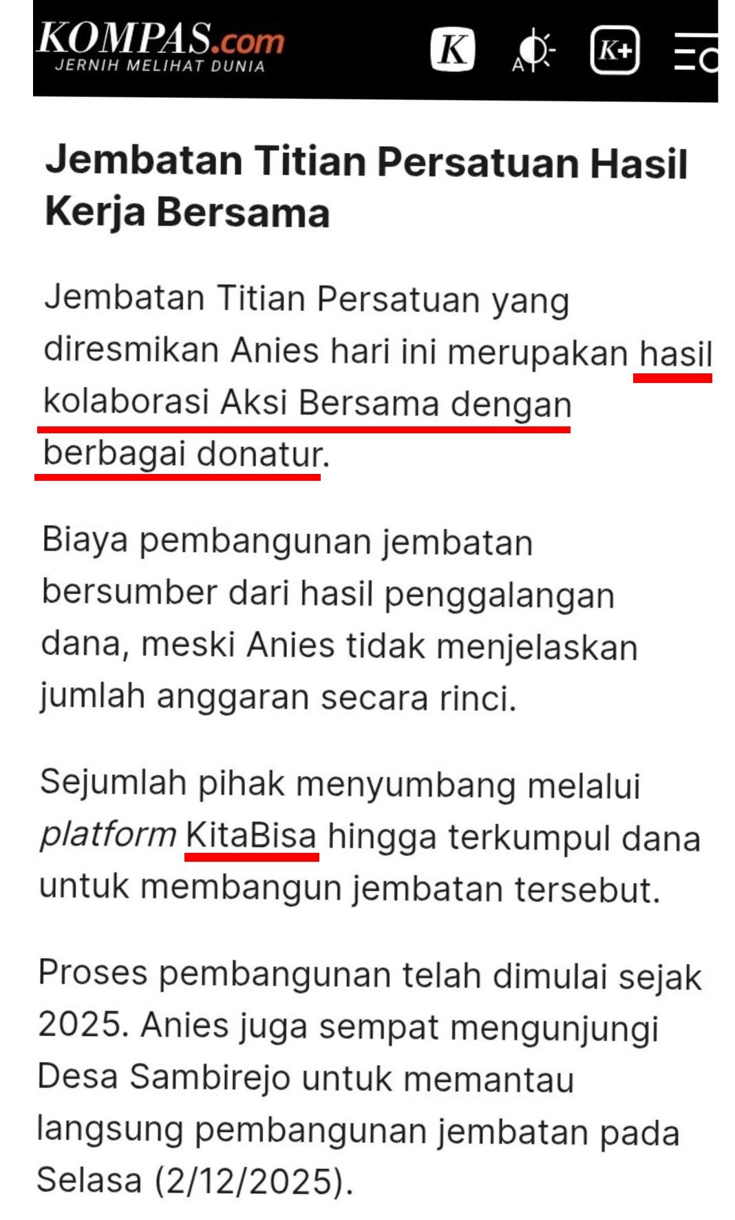 Jembatan Titian Persatuan yang diresmikan Anies merupakan hasil kolaborasi dengan sejumlah pihak, seperti Aksi Bersama dan berbagai donatur yang menyumbangkan dana melalui platform KitaBisa.