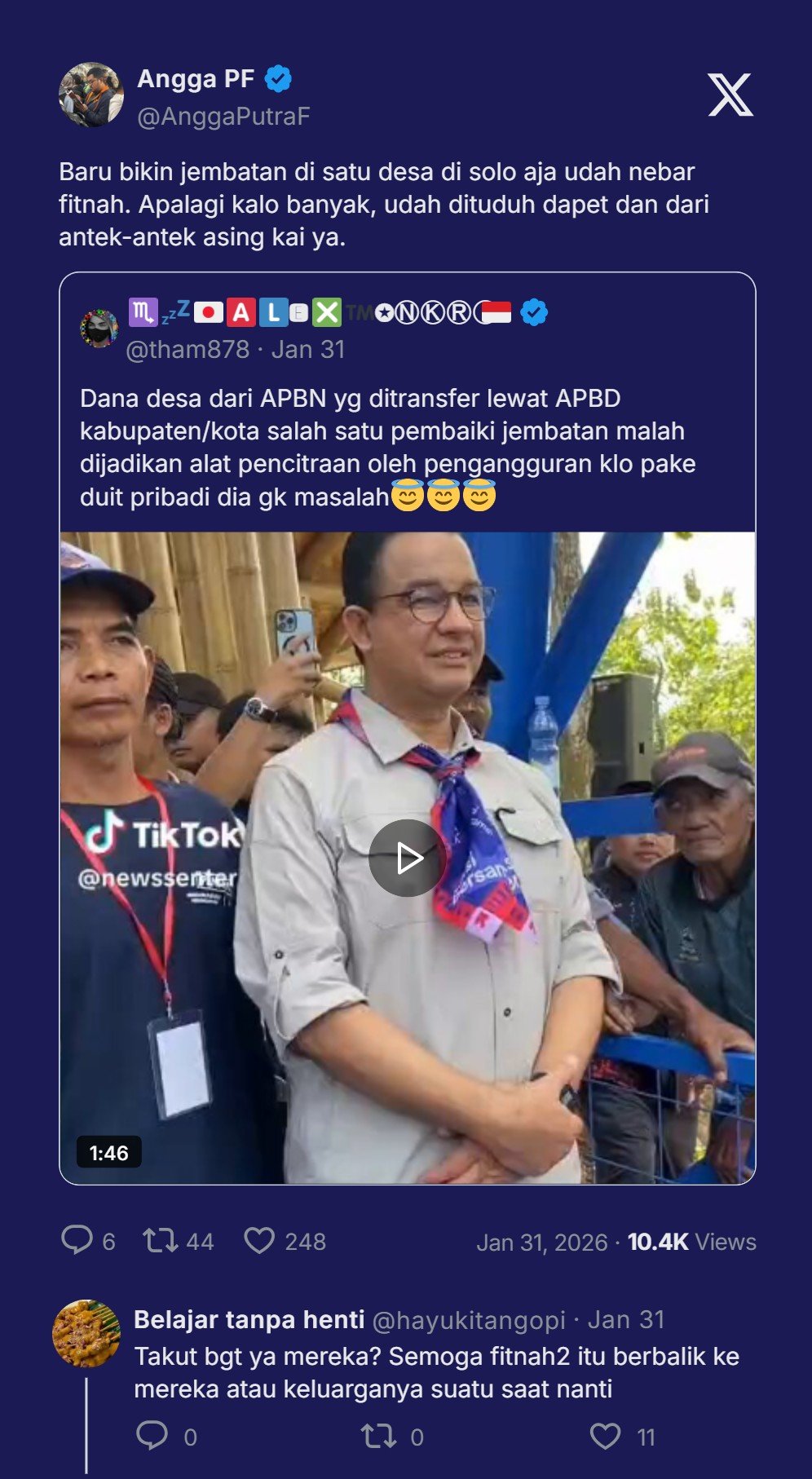 “Dana desa dari APBN yg ditransfer lewat APBD kabupaten/kota salah satu pembaiki jembatan malah dijadikan alat pencitraan oleh pengangguran klo pake duit pribadi dia gk masalah😇😇😇,” begitulah Termul dengan entengnya menebar fitnah.