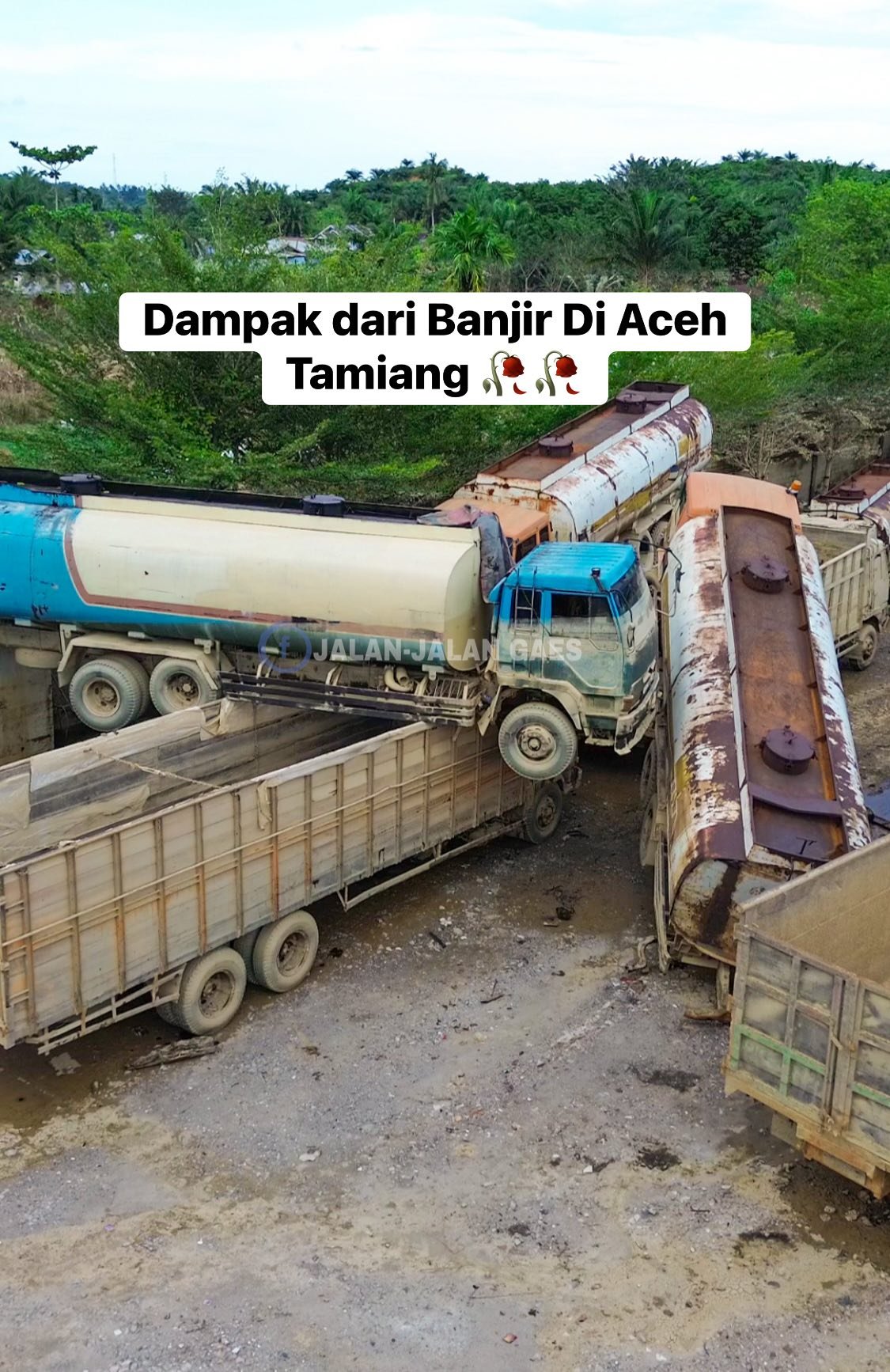 Lihat foto ini. Bayangkan betapa dasyatnya Banjir Bandang di Aceh Tamiang sampai membuat beberapa Truk sampai saling tumpang tindih.