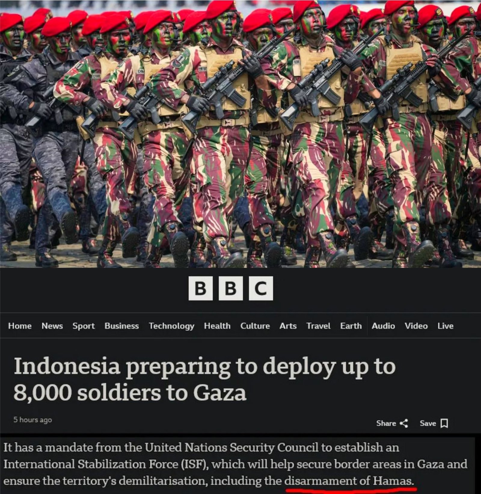 Indonesia memiliki mandat dari Dewan Keamanan PBB untuk membentuk Pasukan Stabilisasi Internasional (ISF), yang akan membantu mengamankan daerah perbatasan di Gaza dan memastikan demiliterisasi wilayah tersebut, termasuk pelucutan senjata Hamas.