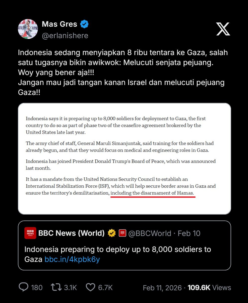 Indonesia menyatakan sedang mempersiapkan hingga 8.000 tentara untuk dikerahkan ke Gaza, negara pertama yang melakukannya sebagai bagian dari fase kedua perjanjian gencatan senjata yang ditengahi oleh Amerika Serikat akhir tahun lalu.