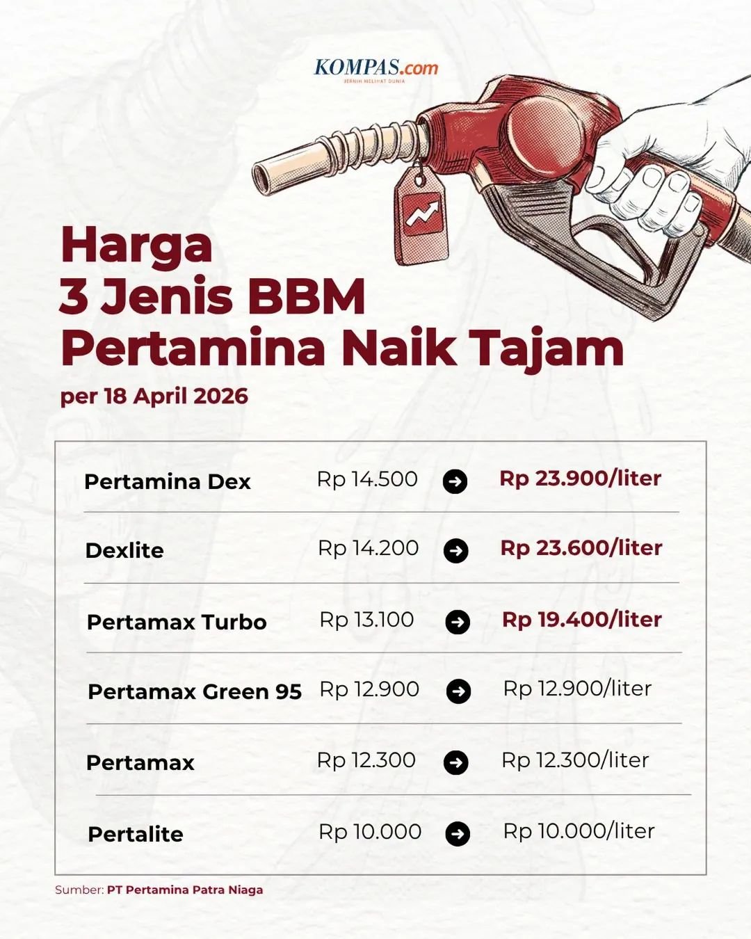 PT Pertamina (Persero) resmi menaikkan harga tiga BBM nonsubsidi per Sabtu, 18 April 2026, yakni Pertamax Turbo, Dexlite, dan Pertamina Dex.