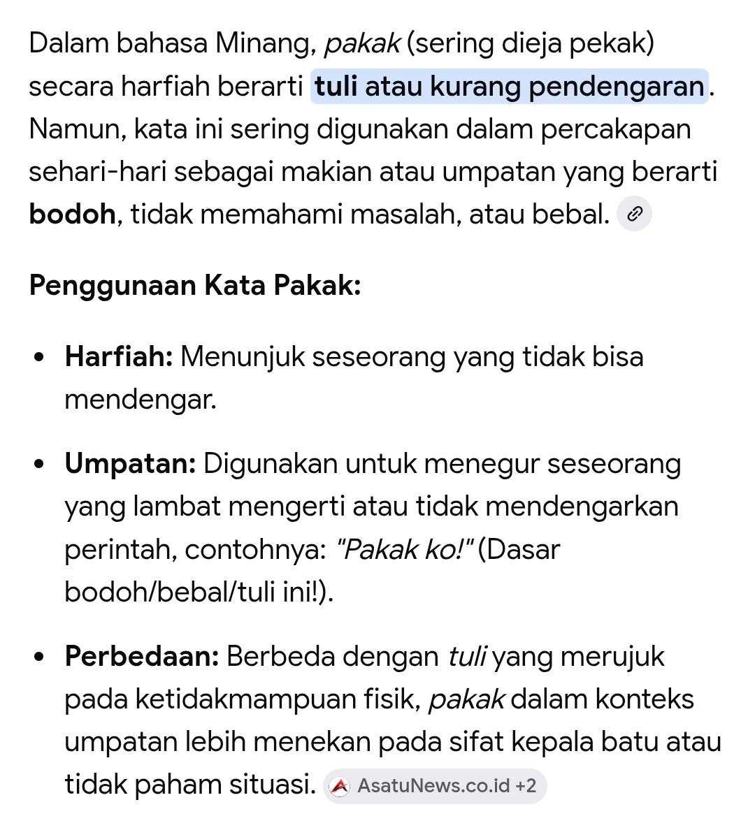 Adapun istilah ‘pakak’ dalam bahasa Minang secara harfiah berarti tuli atau kurang pendengaran. Namun dalam praktik sehari-hari, kata tersebut juga kerap digunakan sebagai umpatan yang bermakna bodoh, bebal, atau tidak memahami persoalan.