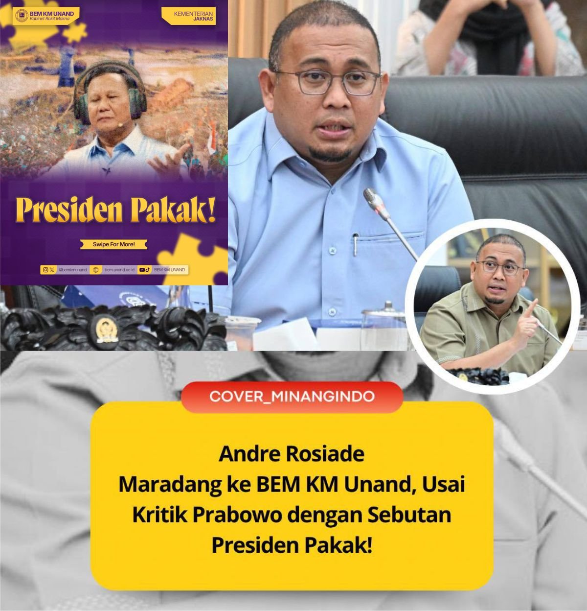 Politikus Gerindra yang menjabat Wakil Ketua Komisi VI DPR RI Andre Rosiade menanggapi unggahan Badan Eksekutif Mahasiswa Keluarga Mahasiswa Universitas Andalas (BEM KM Unand) di akun Instagram @bemkmunand beberapa hari lalu yang menyebut “Presiden Pakak”.